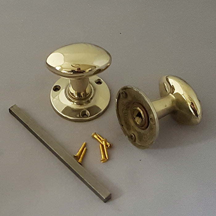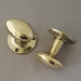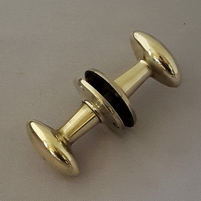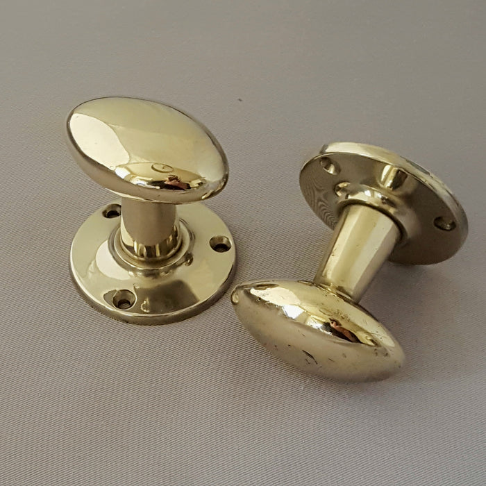 Matching pairs of good quality solid brass oval door handle with a fluted stem and raised back plate. We've described them as mid century as we had some identical ones from a 1950s property, a good mix of a classic oval shaped knob and the more contemporary fluted stem. In a really light shade of brass, they'll tarnish pretty quickly after a bit of use.