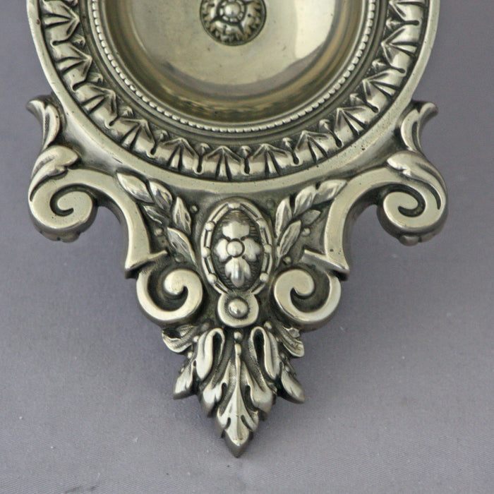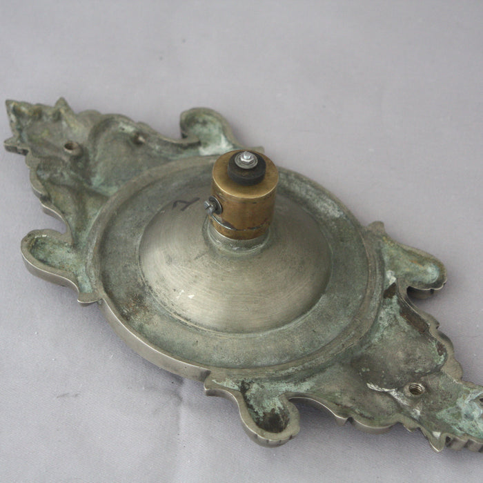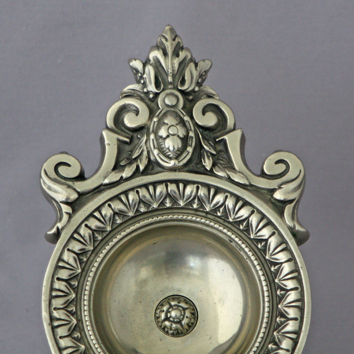 A very large refurbished & working nickel plated front door bell push. I think it's probably European, we've had a few French ones before and it looks & feels very similar. Fairly confident it isn't an antique, but it's had some use, has the older style push and it doesn't feel like a recent casting. It's had a good clean and polished and the overpainting removed. It bolts on from the back, the bolts aren't shown in the photos, approx 120mm long. Alternatively there are a couple of locations where it could be drilled out and screwed. You will require a recess for the back of the push surround (see sizes).