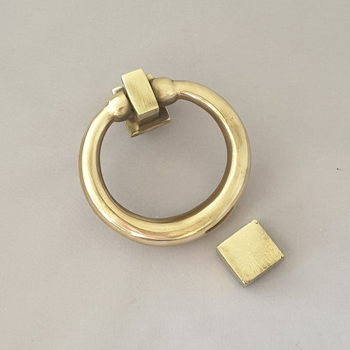 Out of stockA good quality solid brass ring door knocker with a separate strike plate. Quite a heavy item at nearly 1kg, presented in a fairly mid tone of bras...