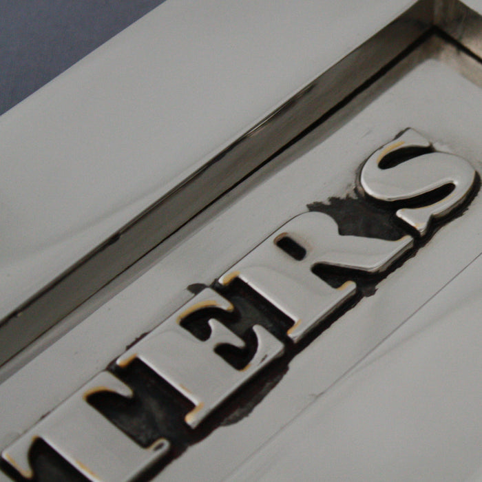 An excellent quality period front door combination of a Classic Victorian nickel letterbox and internal tidy, both items are nickel plated solid brass and come from the same high quality manufacturer. The same set of bolts are used for both items and they go through the tidy into the back of the brass studs on the letterplate.
