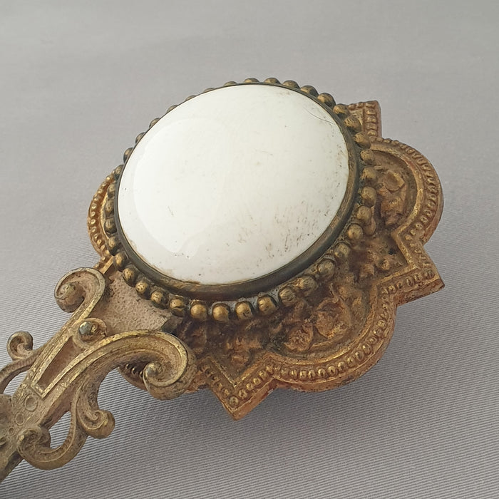 An original early to mid antique Victorian servants call lever with a White ceramic mount. The decorative brass surround and lever has an almost gilt brass finish to them. The pull doesn't have any chain, but does have the connection point & grub screw should you wish to connect it.