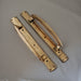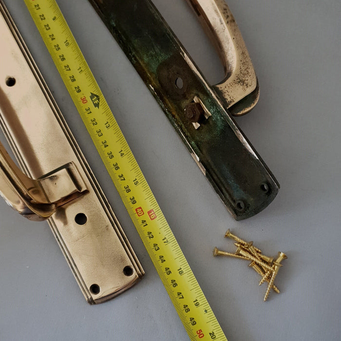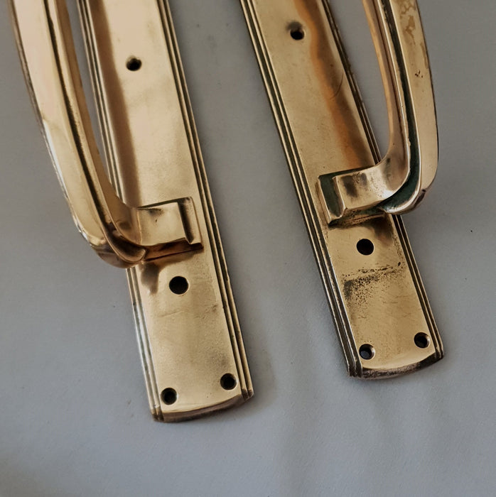Good original condition, they do have some weathering and patina. We've supplied some large dome head brass screws to cover the two old holes where the handles were, they aren't in the pictures. One has a small spilt in the backplate (you can just see it in the pic. left handles near the centre top screw hole).