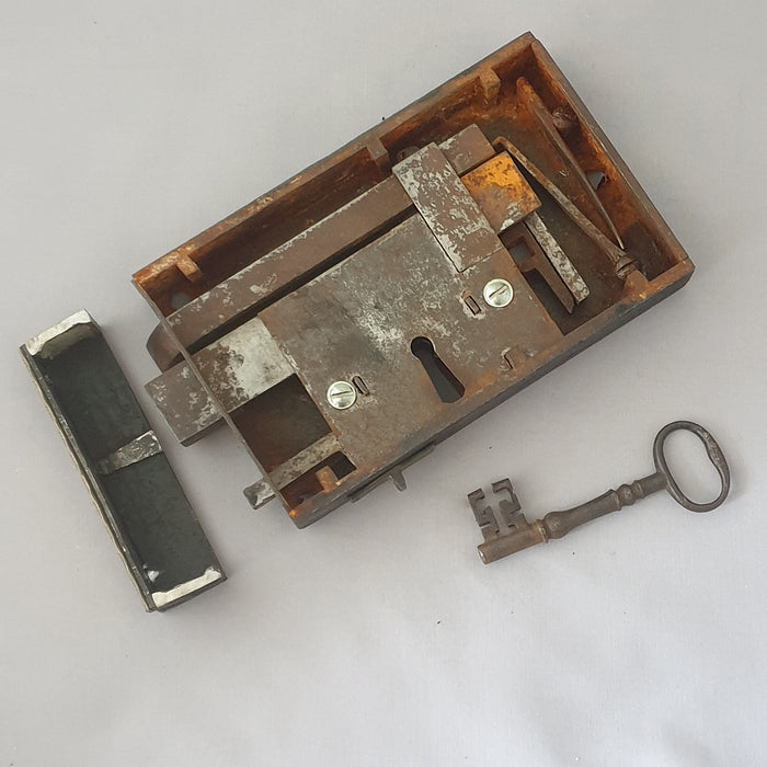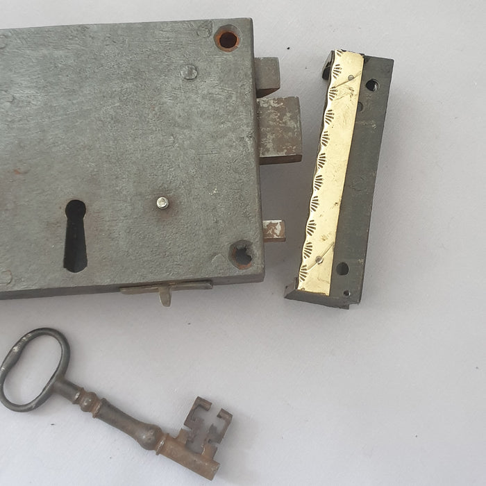 A quite substantial example of a refurbished and lightly refinished late Georgian 7'' right handed antique rim lock with thumb slide bolt. Original key and we made the keep, the key is quite short so possibly won't be long enough to work from the outside (max 45mm thick door).