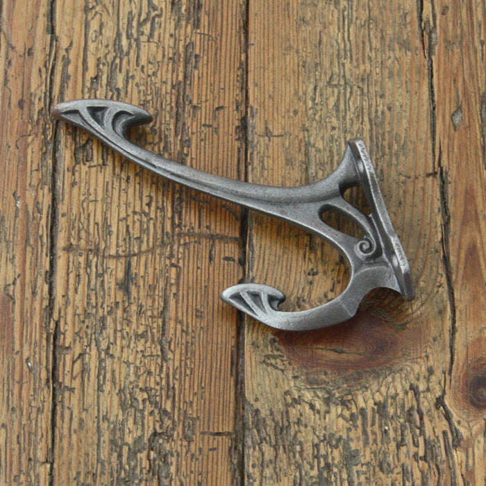 A decorative bare iron hook in a decorative Art Nouveau style.
