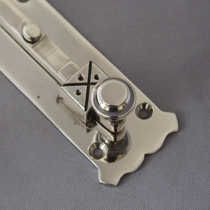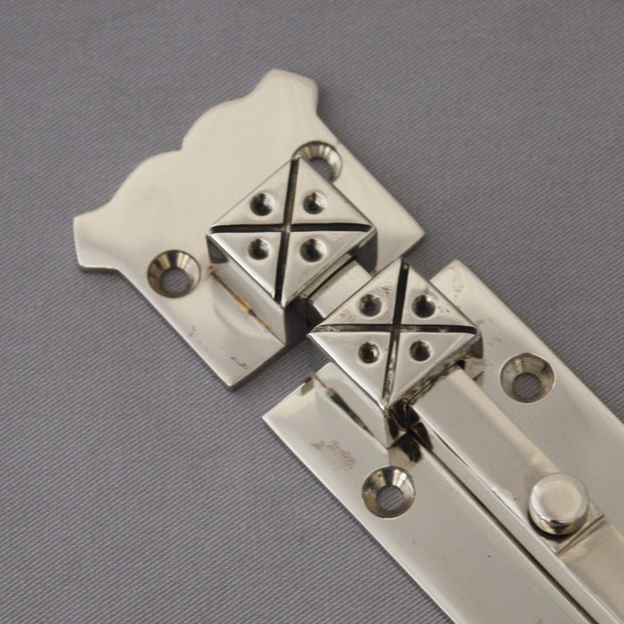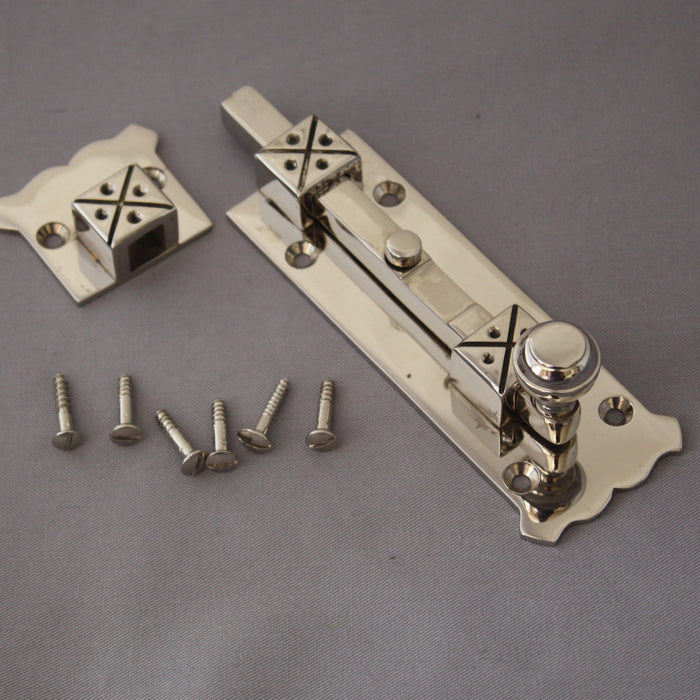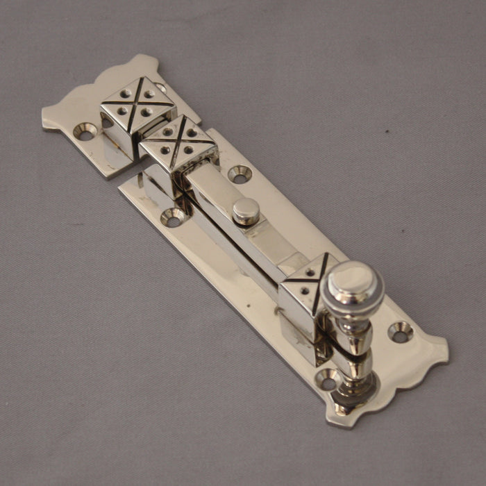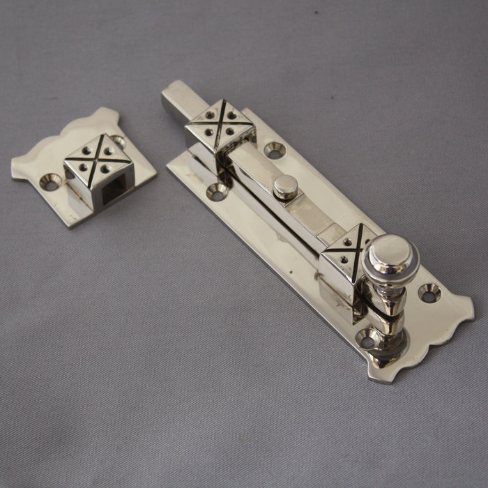 A fantastic quality Arts and Crafts nickel bolt. These are faithfully reproduced from an original bolt reclaimed from a large arts & crafts house in the Midlands owned by the Mander family, founders of Mander Paints. By the late 19th century Mander Paints & Varnishes were the largest manufacturer of paints & varnishes in the British Empire. Nice & heavy at 315g.