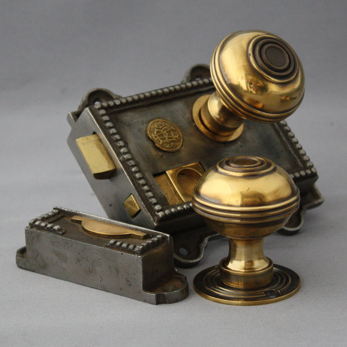 A fantastic quality reproduction rim latch, a solid cast iron case & single lever operation manufactured using original Victorian patterns. This rim latch is un-lacquered so will tarnish down in the traditional way. Dual handed so works on both left & right handed doors. Nice & heavy at 720g, supplied with emergency release catch.