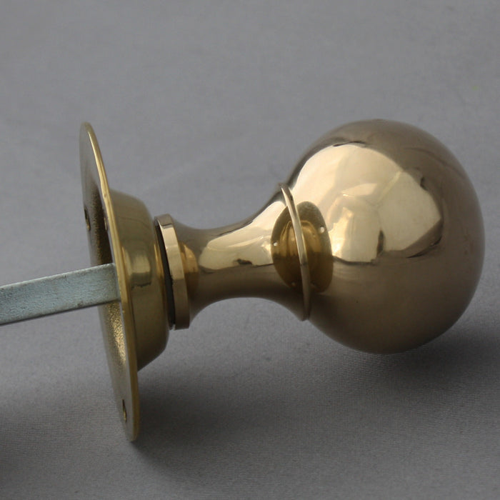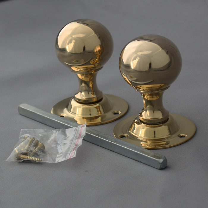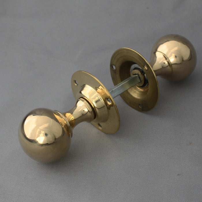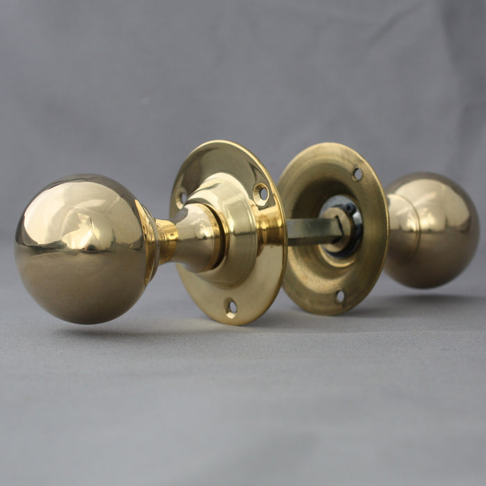 A fantastic quality reproduction pair of reproduction period Edwardian brass ball door handles. A common shape from the late 1800's and onwards. Fixed roses so they only work on mortice locks or latches. Manufactured using original moulds and good quality rich coloured brass, so the proportions and colour are just right for a period door handle. These are unlacquered so they will tarnish and antique down making them ideal for matching in with original handles, using them on old doors or adding a bit of character to new doors. Nice & heavy at 460g per pair.