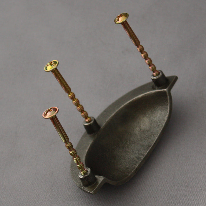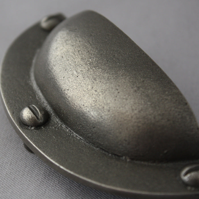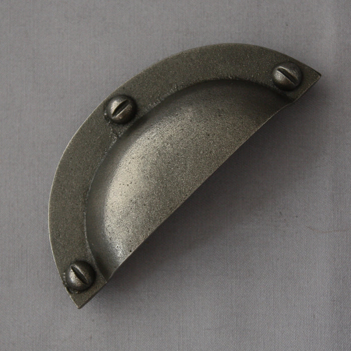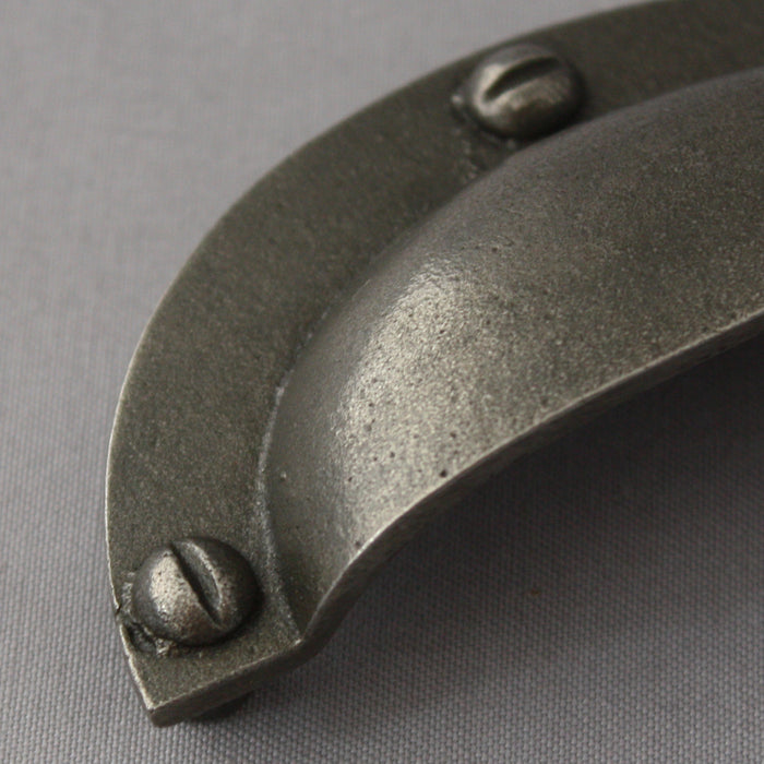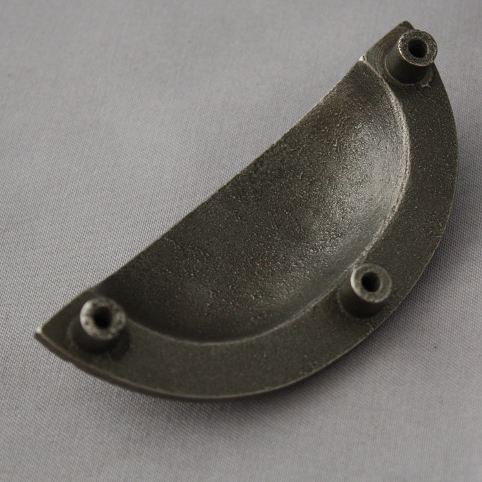 Industrial style cup pull handle with a Black iron antiqued finish, ideal for cabinets, drawer units, furniture and kitchens. This model has lugs and bolts.