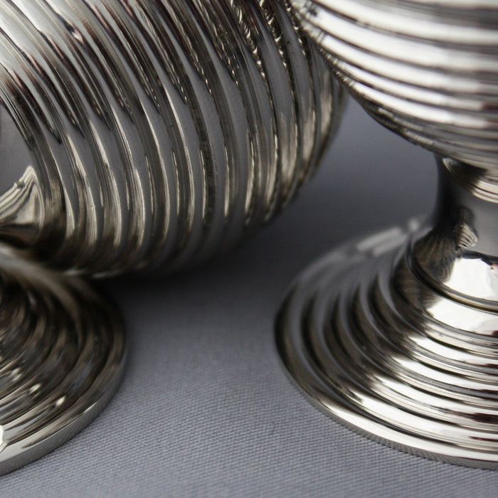 A fantastic quality reproduction pair of large nickel beehive door handles. A very popular style in the Victorian and Georgian period, ideal for larger period doors. Manufactured using original moulds the knobs are un-lacquered and will tarnish down in the traditional way (can also be polished). Nice & heavy at 700g, threaded spindle and separate rose so they fit tight up against the door and/or rim lock.