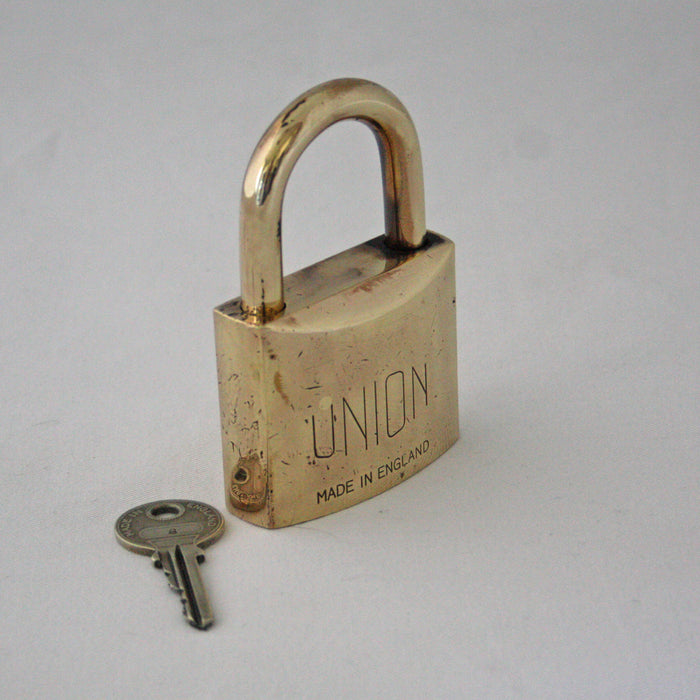 Mid Century Brass Union Padlock £50.00 We currently have 1 in stock. Description Sizes & info Description A large mid to late 1900s brass padlock by Union, stamped Made in England with it's original key, cleaned & lightly polished, in a mid tone of brass. Condition: Good working condition Sizes & info Finish: BrassOverall size: 100mm x 60mm (4in x 2.5in)Shackle diameter: 11mm Inside shackle: 36mm x 32mmStock code: 1595/D/BIncl VAT Quantity Add to cart This item is a recurring or deferred purchase. By continuing, I agree to the cancellation policy and authorize you to charge my payment method at the prices, frequency and dates listed on this page until my order is fulfilled or I cancel, if permitted.