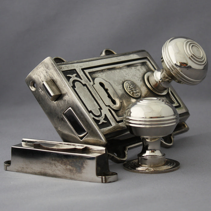 A fantastic quality reproduction Victorian nickel Davenport rim lock. A nickel plated solid brass case & single lever operation manufactured using original Victorian patterns. The antique finish will keep tarnishing but it can be polished back to shiny. Dual handed so works on both left & right handed doors. Nice & heavy at 1500g.
