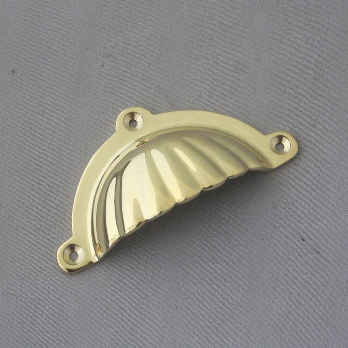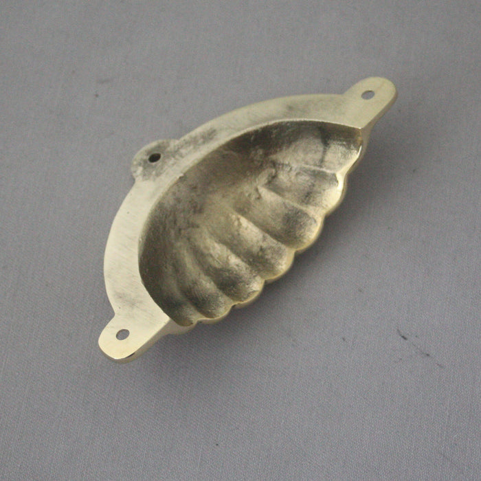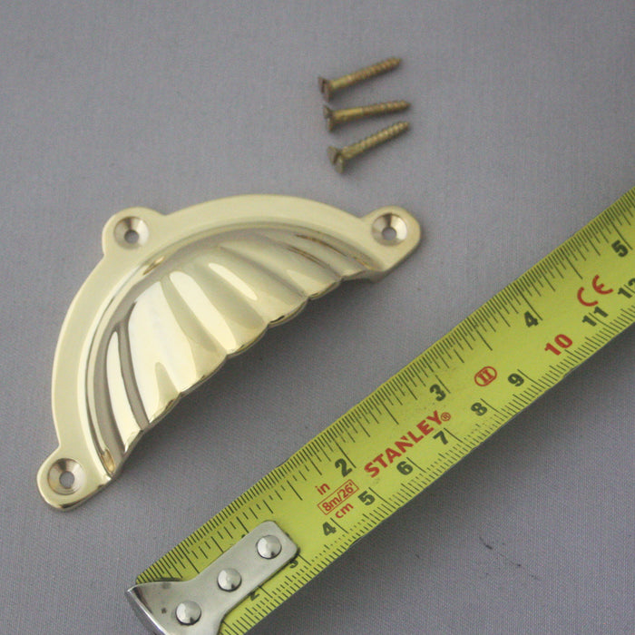 A lovely quality solid brass shell cup or pull cabinet handle, this style is a copy from a Circa 1900 original handle.  In unlacquered brass so it will tarnish, easy enough to keep shiny with a Brasso type product if you prefer. These handles have a range of uses, as door handles, cabinet handles, drawer handles & bin pulls.