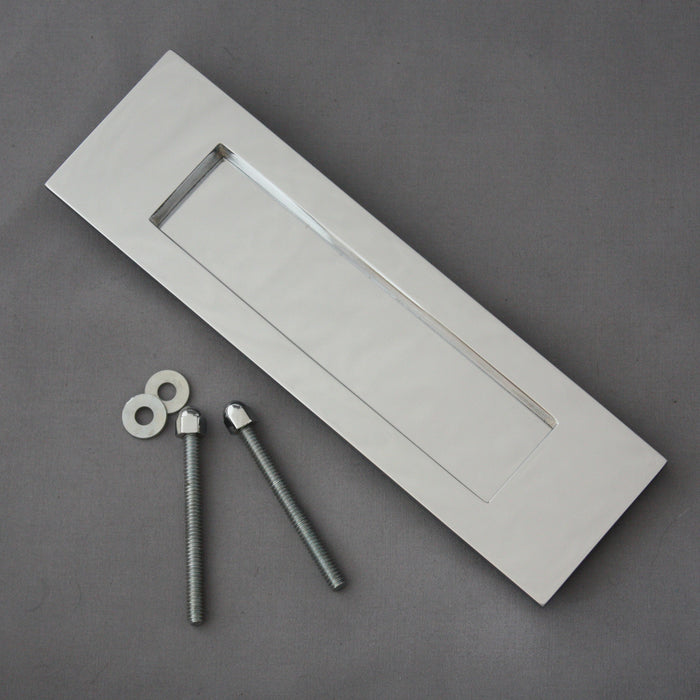 Finish: Polished chrome Width: 70mm (2.75in) Height: 230mm (9in) Projection: 15mm Length of bolts: 80mm Distance between bolts: 190mm (7.5in) Supplied with: Fixing bolts Opening size: 34mm x 150mm (1.5in x 6in) Weight: 430g
