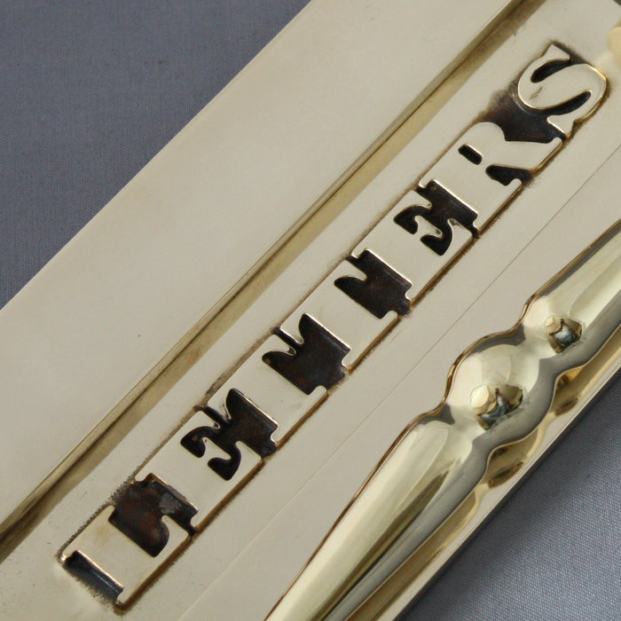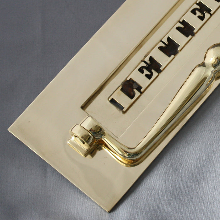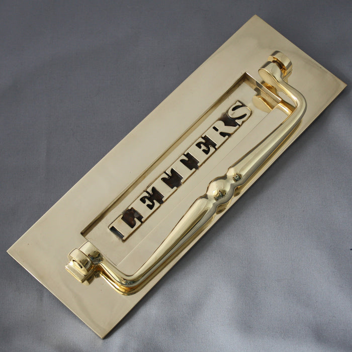An extremely high quality Classic Victorian brass letterbox & clapper weighing in at over 1.6kg (3.5lbs). These front door letterplates are inspired by original Victorian examples but made slightly larger to take the larger letters we receive. The heavy casting is manufactured using a quality rich and warm coloured solid brass, which is unlacquered so it will quickly tarnish and antique down but easily polished back to shiny with a Brasso type product. The spring that operates the solid brass flap with raised 'LETTERS' lettering is very strong to stop the flap opening in a high wind.