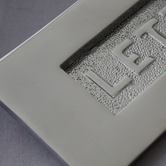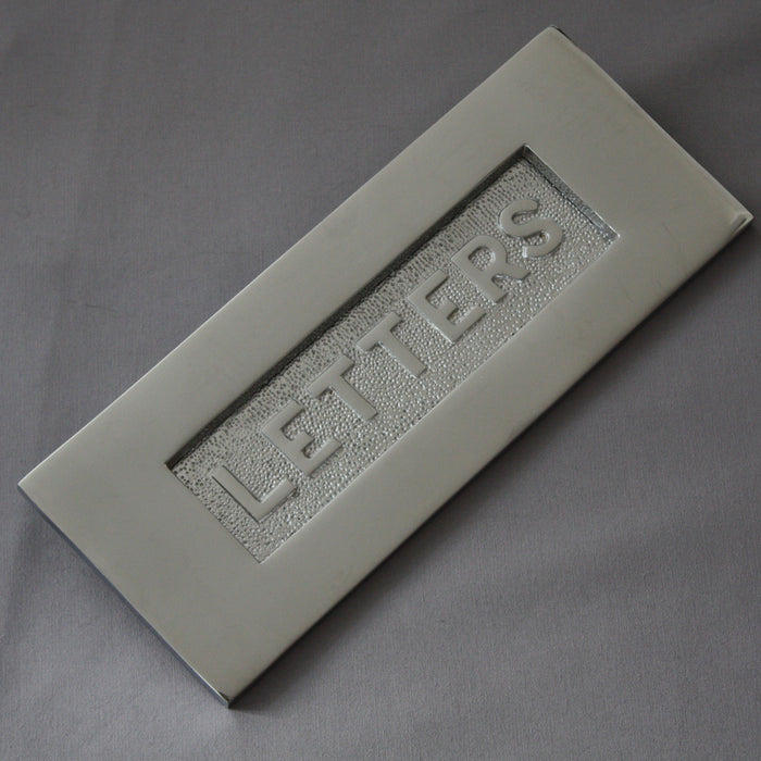 A good sized reproduction Victorian chrome letterbox. The style of period front door letterplate with the hammered 'Letters' on the flap is very much in the late Victorian period but manufactured to a more modern overall size. This one is a good quality sand casting and is quite heavy at 700g.