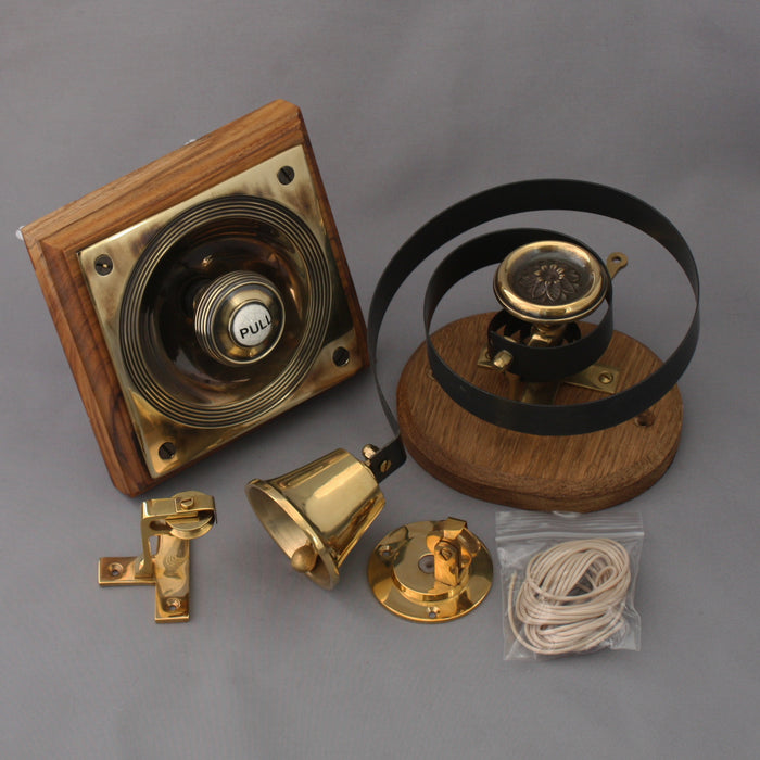 A great quality reproduction Victorian front door pull and bell set. The Claverley pull is a faithful Victorian reproduction made using the lost wax method with a heavy duty return spring. The bell comes from the same manufacturer and both items are mounted on matching oak back plates and are supplied with instructions and various pulleys. There are two options for the decorative front, flower or lady. You can read more about the claverley pull and front door bell.